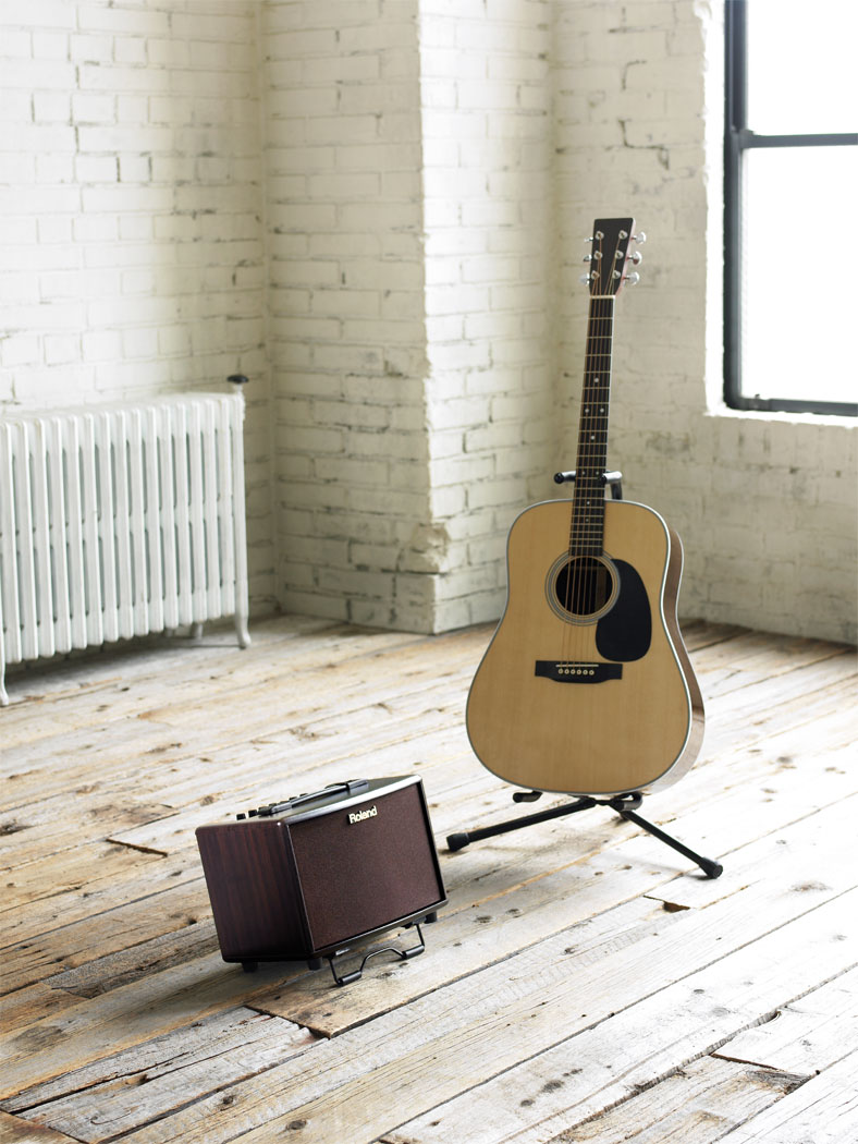 Acoustic guitar combo amp ROLAND Ac-33. Rich, deep, stereo sound, the AC-33 is the world's first AA battery-powered amp made specifically for acoustic guitar. Portable yet powerful, the AC-33 provides true stereo sound, Guitar and Mic/Line channels, custom-tailored effects, anti-feedback, and a Phrase Looper. But this amp was made to go places no amp has gone before. Thanks to its battery-power capability, the AC-33 lets you take your act anywhere into the backwoods, onto the streets, or wherever your imagination leads you.