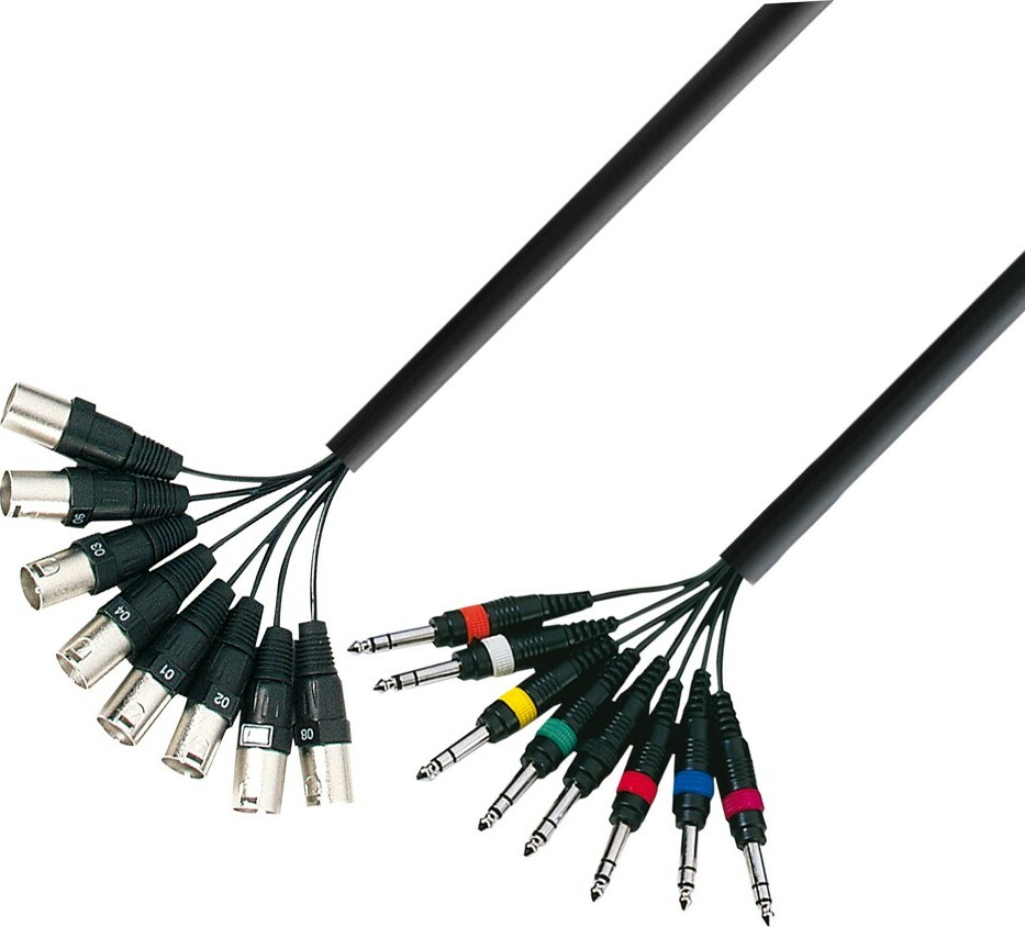 8-pair multipair cable, for use in the studio or on stage box with moderate solicitations, equipped on one end with 8 Adam Hall male XLRs and on the other with 8 TRS 6.35 mm jacks. Individual numbering of the pairs, printed on the ducts, plus color marking on the jack connectors