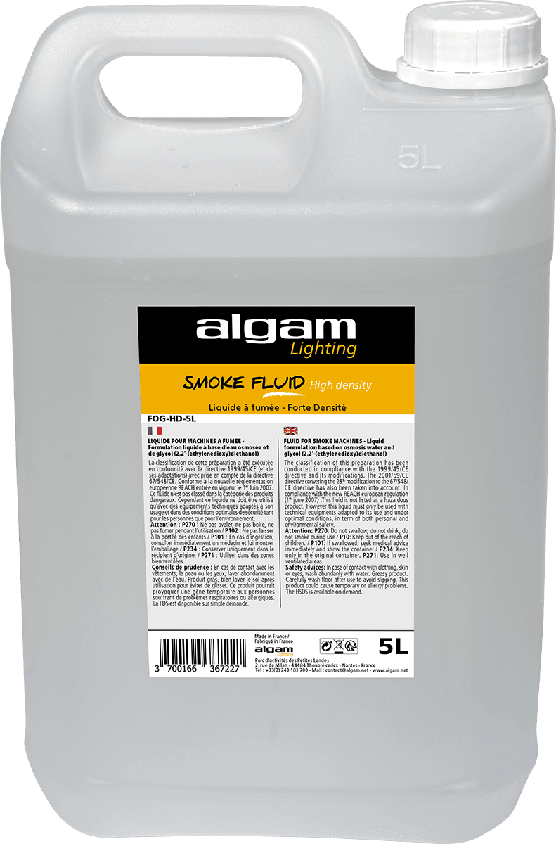 Producing a compact and homogeneous smoke, high density liquids will be perfect in larger spaces, with increased stability for a real permanent haze effect. 5 litre canister.