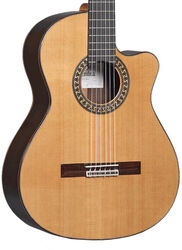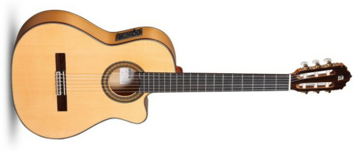 Entirely handcrafted with solid woods, the ALHAMBRA Flamencas Conservatorio 7 Fc CW E8 classical acoustic/electric guitar, features german Spruce for the top, Cypress for the back and sides, fine-looking and high quality ebony for fingerboard and Fishman Flex M Blend system (blendable matrix pickup + conder microphone for wide variety of amplified sounds).