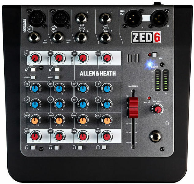 Compact 6 input analogue mixer // ZED-6 has been created for musicians, singer / songwriters and venues seeking Allen & Heath’s renowned build and audio quality in a compact, portable format. Whether it’s bouncing ideas around at home, performing live or recording tracks to share on YouTube and Soundcloud, ZED-6 is a versatile companion for every step of the creative journey. Featuring the new GSPre boutique preamp design, developed from the revered GS-R24 studio recording console, the ZED boasts exceptionally low noise and massive headroom, with a signature analogue warmth and depth. Guitarists will be pleased to know that ZED-6 comes with a pair of Guitar DI high impedance inputs, allowing guitars to be plugged straight into the mixer without the hassle and expense of carrying separate DI boxes.