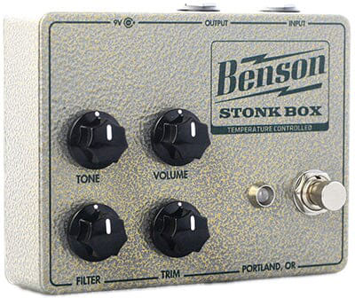 Like the Germanium Fuzz before it, the Stonk Box attempts to take a classic 1960’s fuzz design, and bring the sound into the modern world without bringing any along the flaws and inconsistencies of the original. In this case, Benson Amps set their eyes on the MK1 fuzz (which is itself a modified version of the very first fuzz ever). They kept the original controls (FILTER and VOLUME), and added a TONE control and a TRIM control to expand the palette of sounds available.