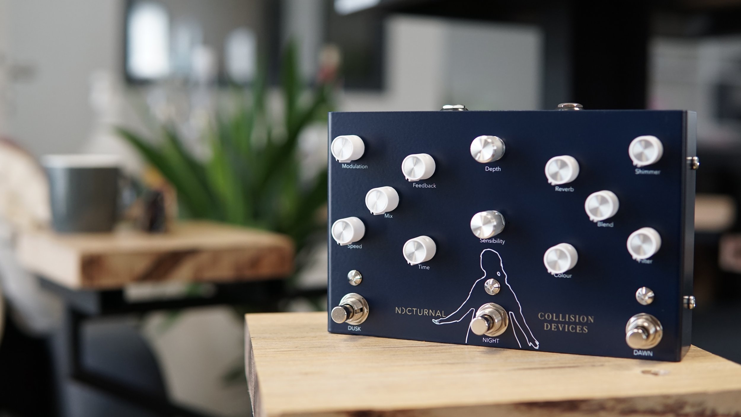 Collision Devices' Nocturnal is a Shimmer Reverb with Modulated Delay & Dynamic Tremolo. Hand-made in France, Collision Devices creates top-notch guitar pedals for players who seek for new ambiances and territories.