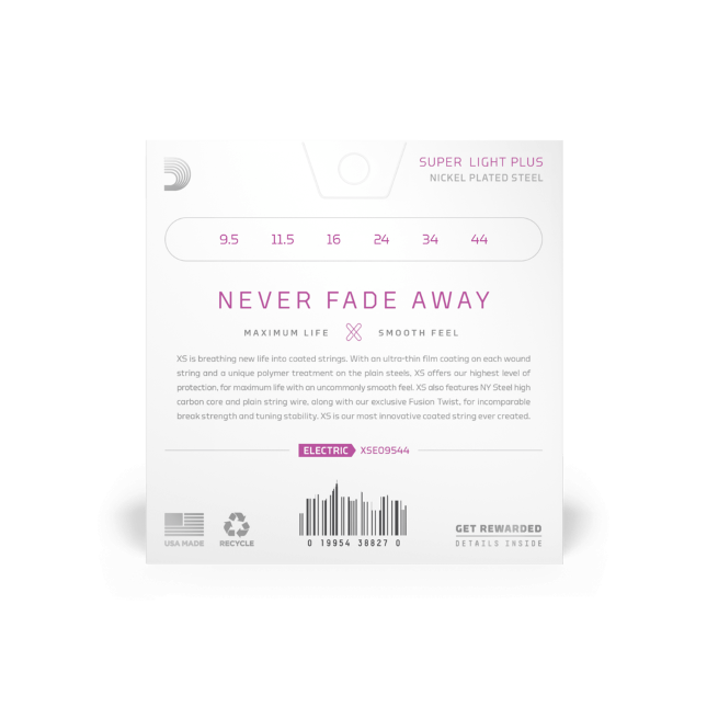 XS Nickel Coated Strings feature the longest life of any D'Addario electric guitar string. These premium electric guitar strings feature our revolutionary XS coating, which gives them maximum life and a smooth, fast feel without drowning out their remarkable tone. Featuring a NY Steel core, reformulated nickel-plated steel winding, and Fusion Twist technology, XS Nickel strings deliver superior strength and tuning stability, with richer harmonics, improved clarity, and remarkable definition for every note, slide, and bend. 9.5-44 Super Light Plus strings are a great middle ground between 9 and 10 gauges, and are ideal for maintaining balanced tension across multiple guitars of varying lengths.
