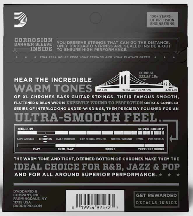 D'ADDARIO ECB81SL 4-String Set Chromes Flat Wound Electric Bass Super Long Scale Regular Light 45-100. XL Chromes are among the warmest, mellowest bass strings we have to offer. These flat wound strings provide an ultra-smooth feel and a dark, yet warm tone, while allowing movement across the fretboard with no finger noise. Made with a high carbon steel core, Chromes stainless steel flattened ribbon wrap wire is expertly wound onto a series of interlocking under-windings, then precisely polished for unparalleled smoothness and a tonal presence which blends beautifully into the mix.