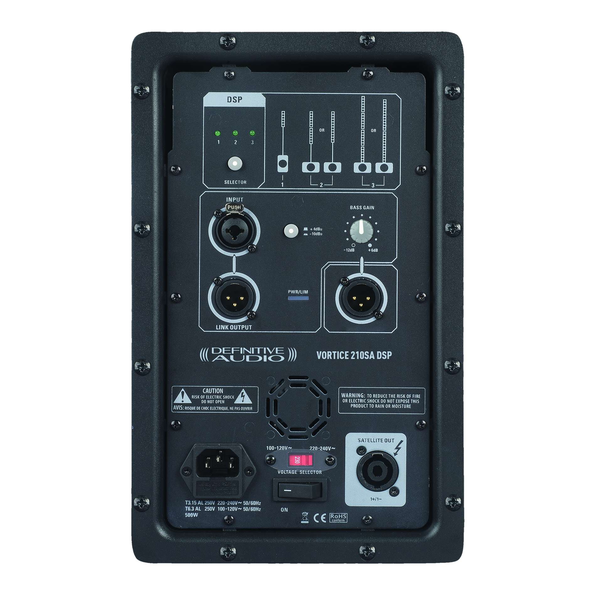 - Outputs: balanced XLR, XLR link for Vortice 210SA box and speakon for Vortice columns