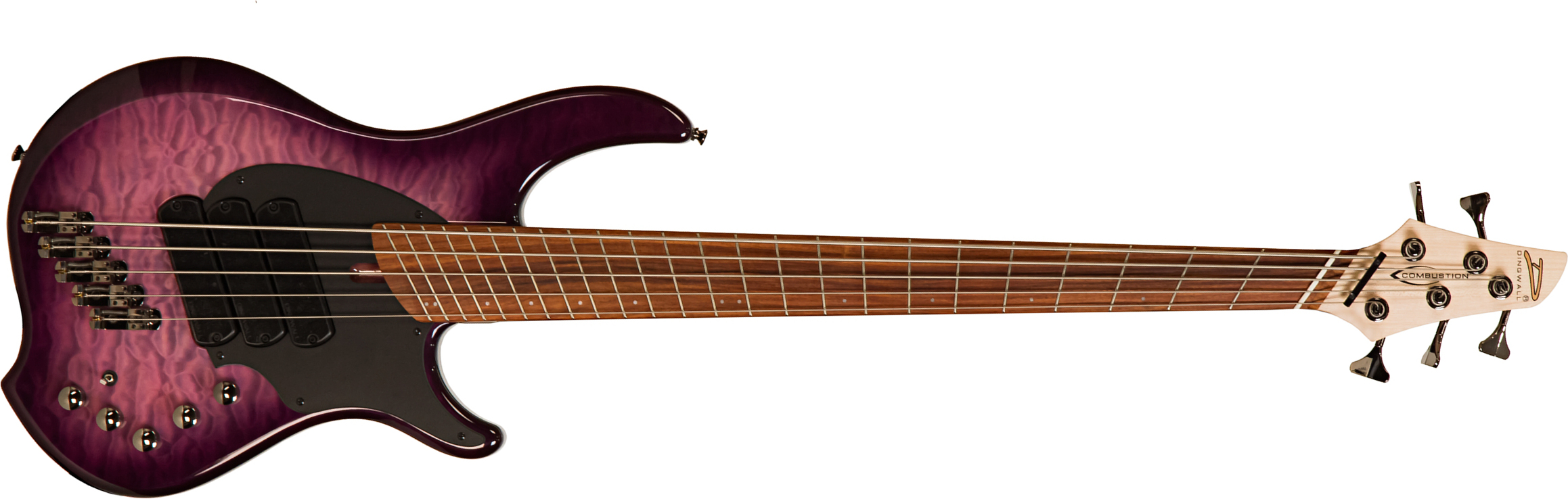 DINGWALL Combustion 5 3-Pickups (PF, UV) is a solid body electric 5-string bass with active/passive EMG electronics, Alder body, high stability 5-pieces Maple neck, 24 fan frettes multi-scale fingerboard.