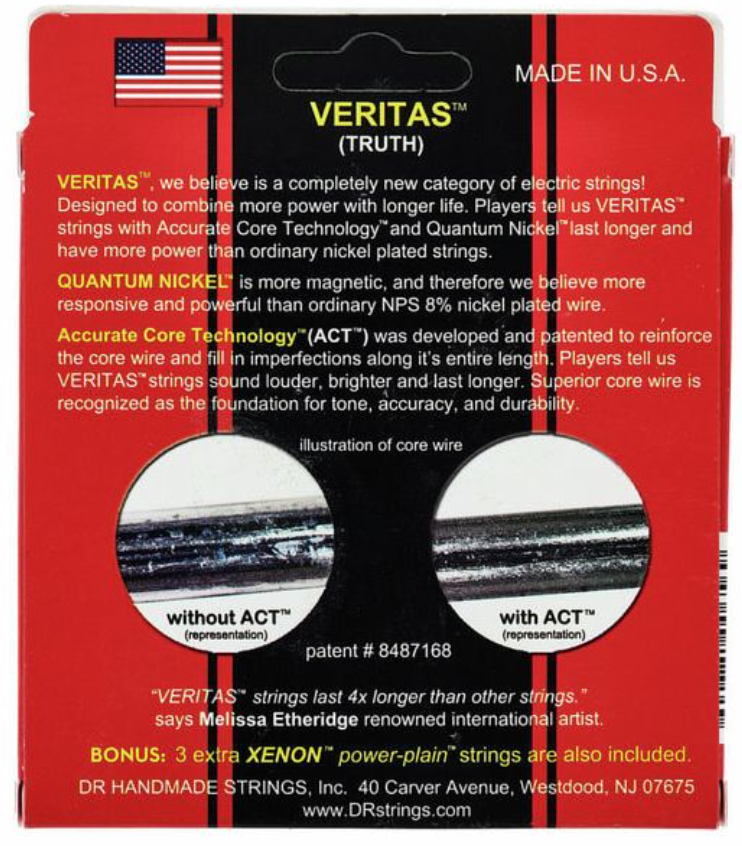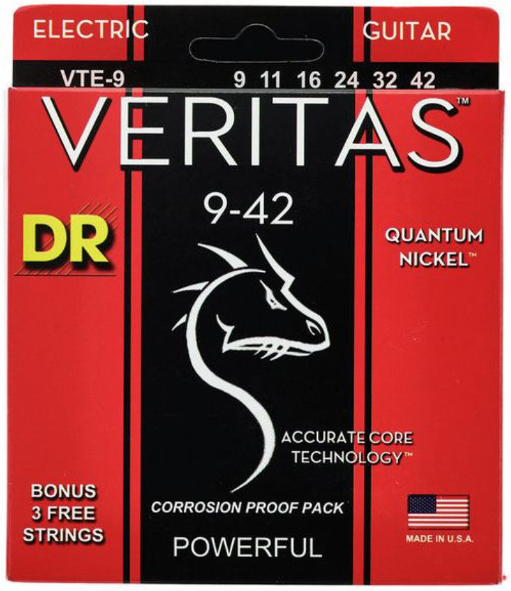 DR STRINGS VTE-9 6-String Set Veritas Coated Core Technology Electric Guitar Light 9-42 maintain their tone, tuning stability and intonation thanks to Coated Core Technology™, a process of coating the round core wire, which locks the wrap wire in place and extends string life by protecting the core from corrosion. A Quantum Nickel™ wrap wire delivers more power, brighter tone and greater flexibility and responsiveness.