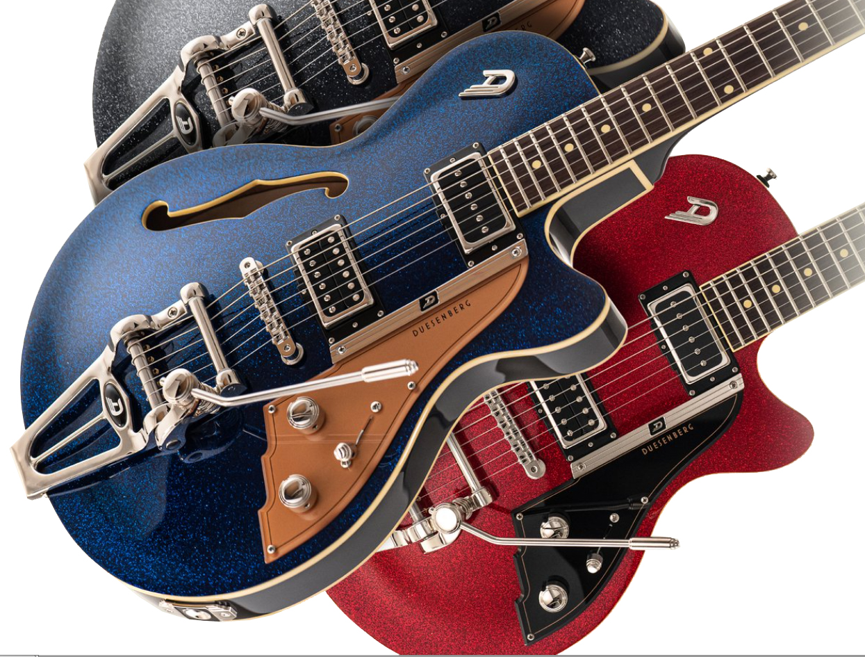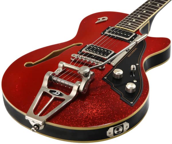The DUESENBERG Starplayer TV (Red Sparkle) semi-hollow body electric guitar (with internal sustain bloc), is constructed the same way as regular Starplayer TV (semi-hollow, dual pickup, 22 fret electric guitar, Spruce arched top and Maple back - layered tonewoods), bent sides and a 648 mm scale.