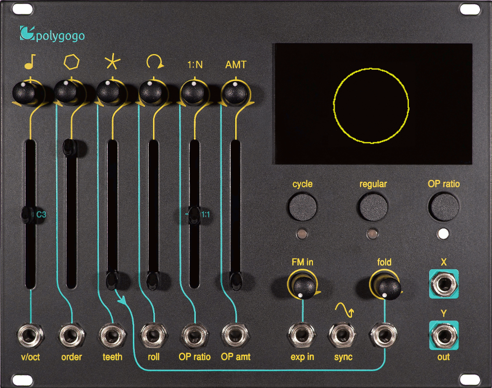E-RM polygogo is the first digital stereo oscillator featuring the brand new polygon synthesis technique. Based on the complex two-dimensional modelling of sine wave amplitude, the Polygogo is a high-quality, performance-oriented instrument with which to explore fascinating sounds and shapes. Thanks to the combination of polygon synthesis, two internal modulation sources and a fully analogue overflow stage, the module is capable of generating an extremely wide range of animated spectra, from lush drones and massive basses to sounds reminiscent of acoustic instruments.