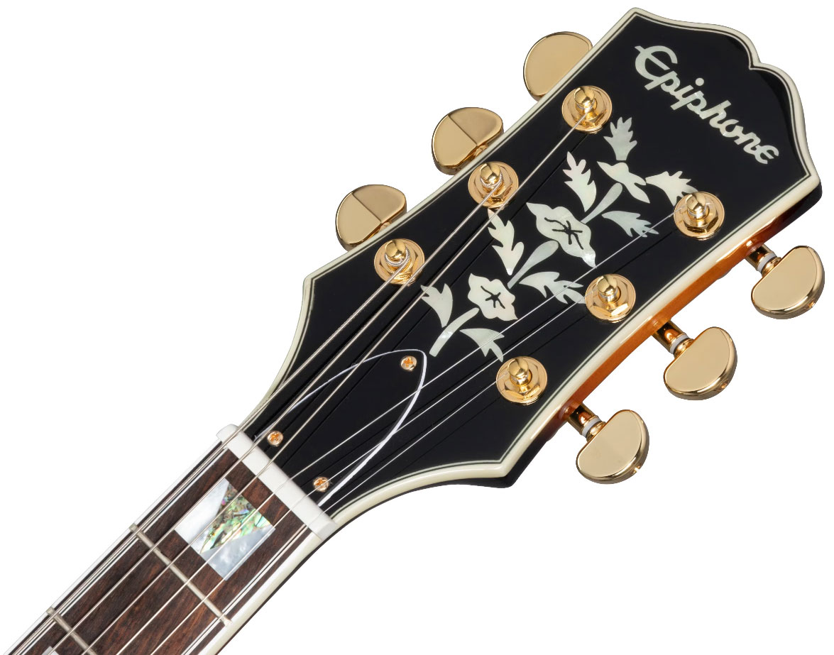 The 22-fret, mahogany neck has a bound Indian laurel fretboard with block mother of pearl with abalone triangle inlays. The bound headstock has a historic Epiphone logo and tree of life in mother of pearl.