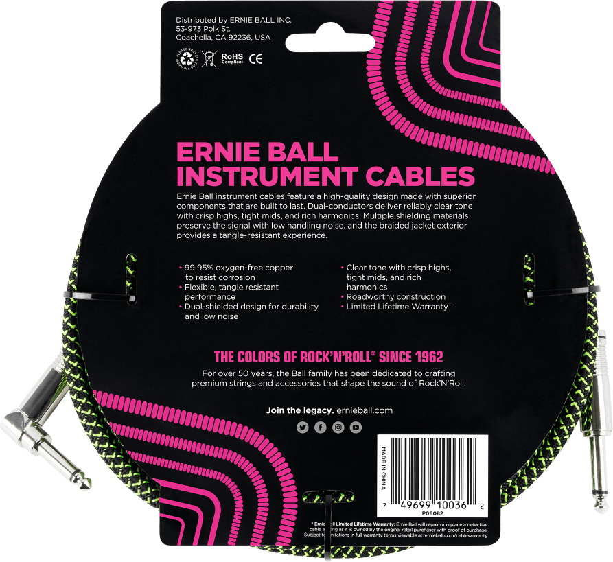 ERNIE BALL P06082 Braided 18ft Straigth / Angle Instrument Cable Black & Green features a high-quality design made with superior components that are built to last.