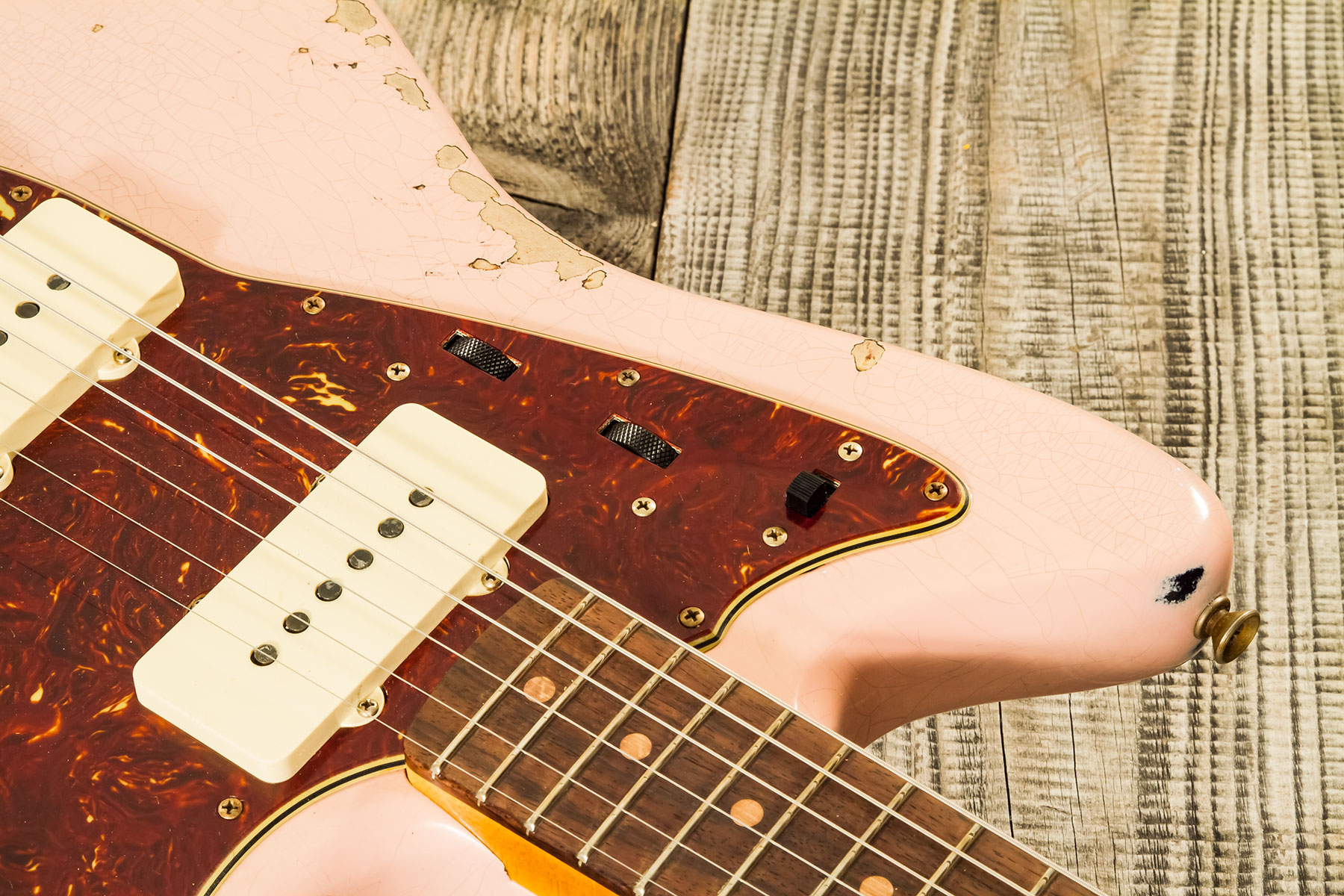 Developped around a "1962 Jazzmaster Base Model",FENDER Custom Shop 1962 Jazzmaster Heavy Relic Super Faded Aged Shell Pink Over 3-Color Sunburst #R132659 (9238014248) solid body electric guitar features 2-piece Alder body, "plain grain" Maple neck (60's Oval C profile, 9.5" radius), Rosewood fretboard (Dunlop 6105 narrow-tall frets, 9.5" radius), Custom Shop Hand-wound Jazzmaster pickups and traditional/vintage-style parts.