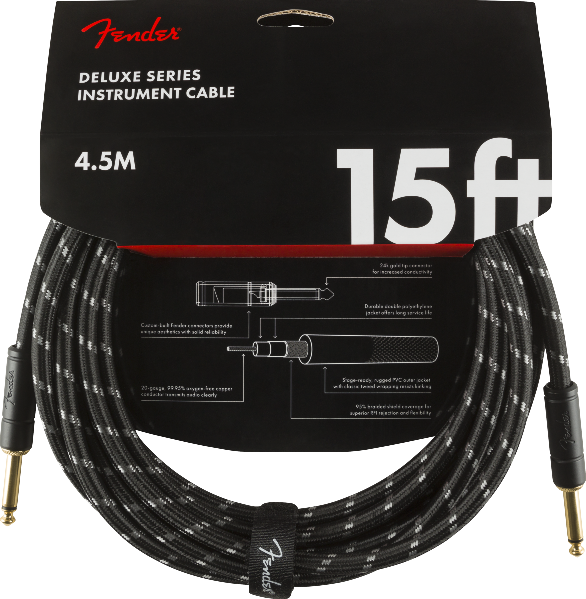 FENDER Deluxe Series Instrument Cable, Straight/Straight, 15ft Black Tweed (0990820083) carries the highest quality materials and braided shielding to deliver flagship durability, conductance and transparency.