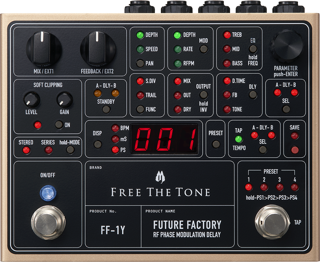 The FF-1Y has a dedicated 3-band equalizer for delay sound. Tonal adjustments of delay sound are indispensable for handling various musical phrases. This 3-band EQ can select a frequency to match the instrument to be used. This is a useful feature for guitarists and bassists, as well as saxophonists, violinists, DJ’s, or keyboardists.