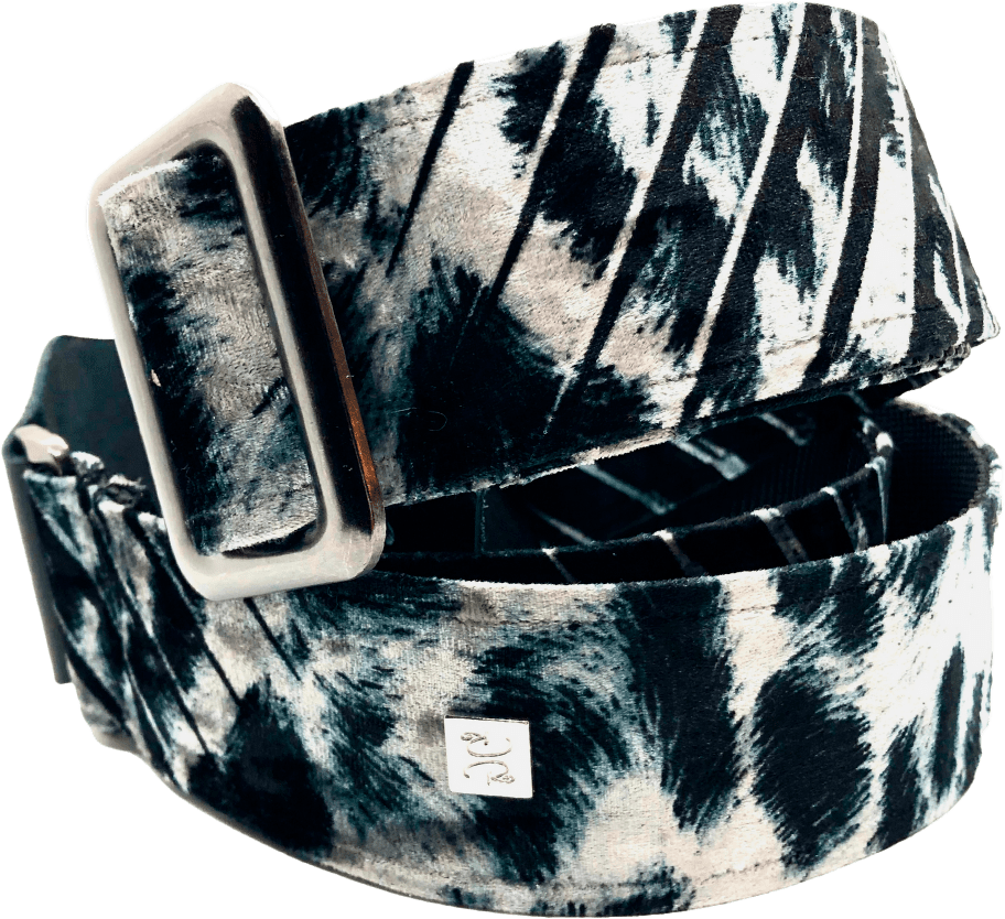With a wild mix of leopard spots and animal stripes in two colors, this strap exudes luxury! Choose from a black and white mix or black and turquoise. Get'm Get'm has named it in honor of the fearless Casandra Carson of Paralandra. The covering is made of soft printed velvet. This multi-tonal print makes each strap unique with its slight variations in shades and patterns. Fully adjustable up to 165 cm, these straps are perfect for guitarists of all sizes! Their metal accessories with pewter finish are free from heavy metals and harmful substances.