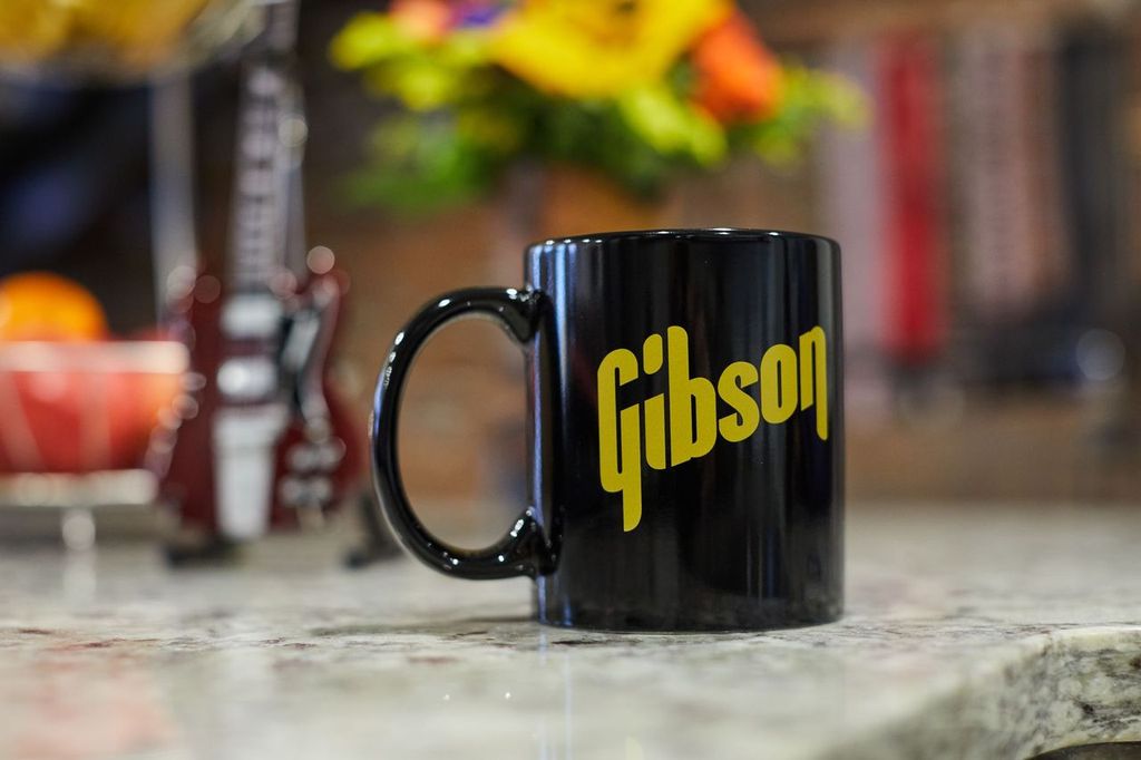 The vintage Gibson logo is featured in a shimmering Vegas Gold on a sleek eleven ounce black mug.