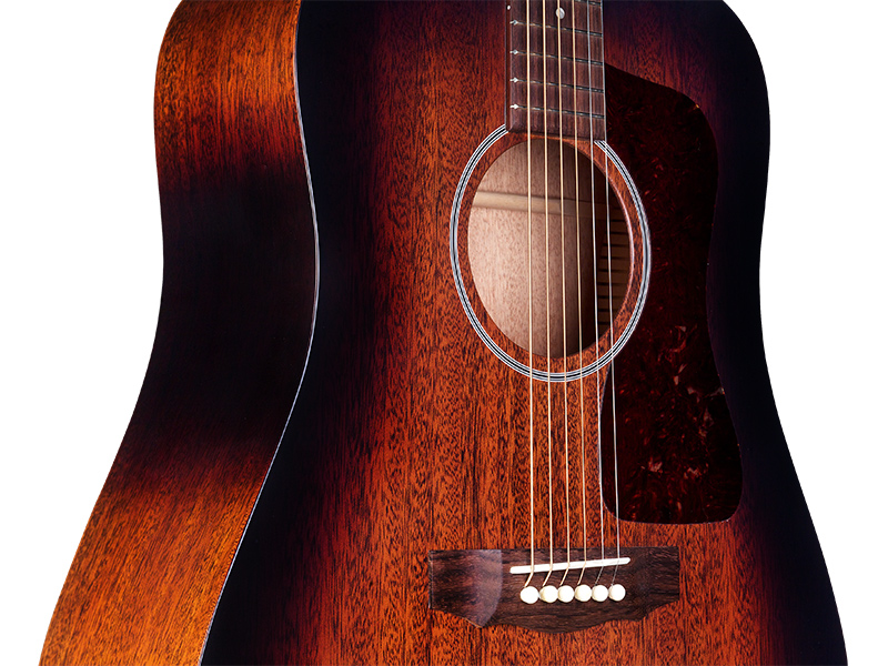 The GUILD USA D-20 (Vintage Sunburst) is a dreadnought acoustic guitar built with solid mahogany top, back, and sides. First introduced to the Guild line in 1968, this model features a rosewood bridge and fingerboard, bone nut and saddle, and an extremely light satin finish that allows this guitar to truly sing. The D-20’s modest appointments include a vintage style rosette and Guild’s peak logo inlaid in mother-of-pearl on the headstock. Each D-20 comes with a hand-signed, numbered certificate of authenticity, and ships with a hardshell case.