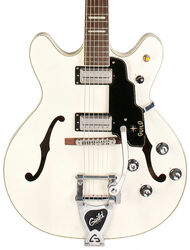 Featuring Guild’s iconic double-cutaway Starfire body shape, the GUILD Newark St. Collection Starfire VI (GU307) has stunning Shoreline Mist finsih and a solid centerblock. Dual LB-1 Little Bucker pickups, replicas of Guild’s 1960s smaller size humbucking pickups, offer a range of tones well-suited for a variety of playing styles and genres. The Starfire VI has a three-piece maple/walnut/maple neck and a bound rosewood fingerboard inlaid with mother-of-pearl and abalone V-blocks. It also features a pinned Tune-o-Matic bridge with rosewood base, rosewood bridge, and comes adorned with gold hardware, 5 ply black and ivory purfling, deluxe f-hole and body binding, and a Guild Vibrato Tailpiece. It’s available in a high gloss blonde finish, and includes a hardshell case. Guild’s most deluxe Starfire on the market, the VI has the vintage look, tone, and feel that you can only get from a Guild Starfire.