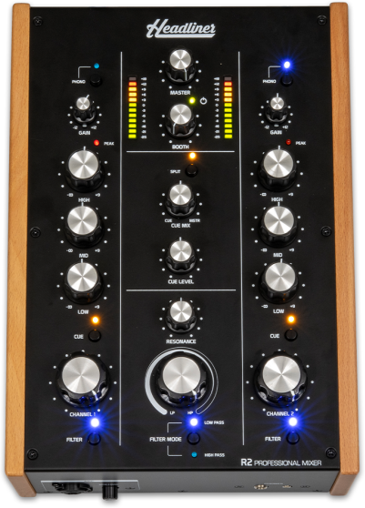 The Headliner R2 DJ mixer offers precise sound control with its high-pass and low-pass filters, as well as its 3-band isolator EQ on each channel.
