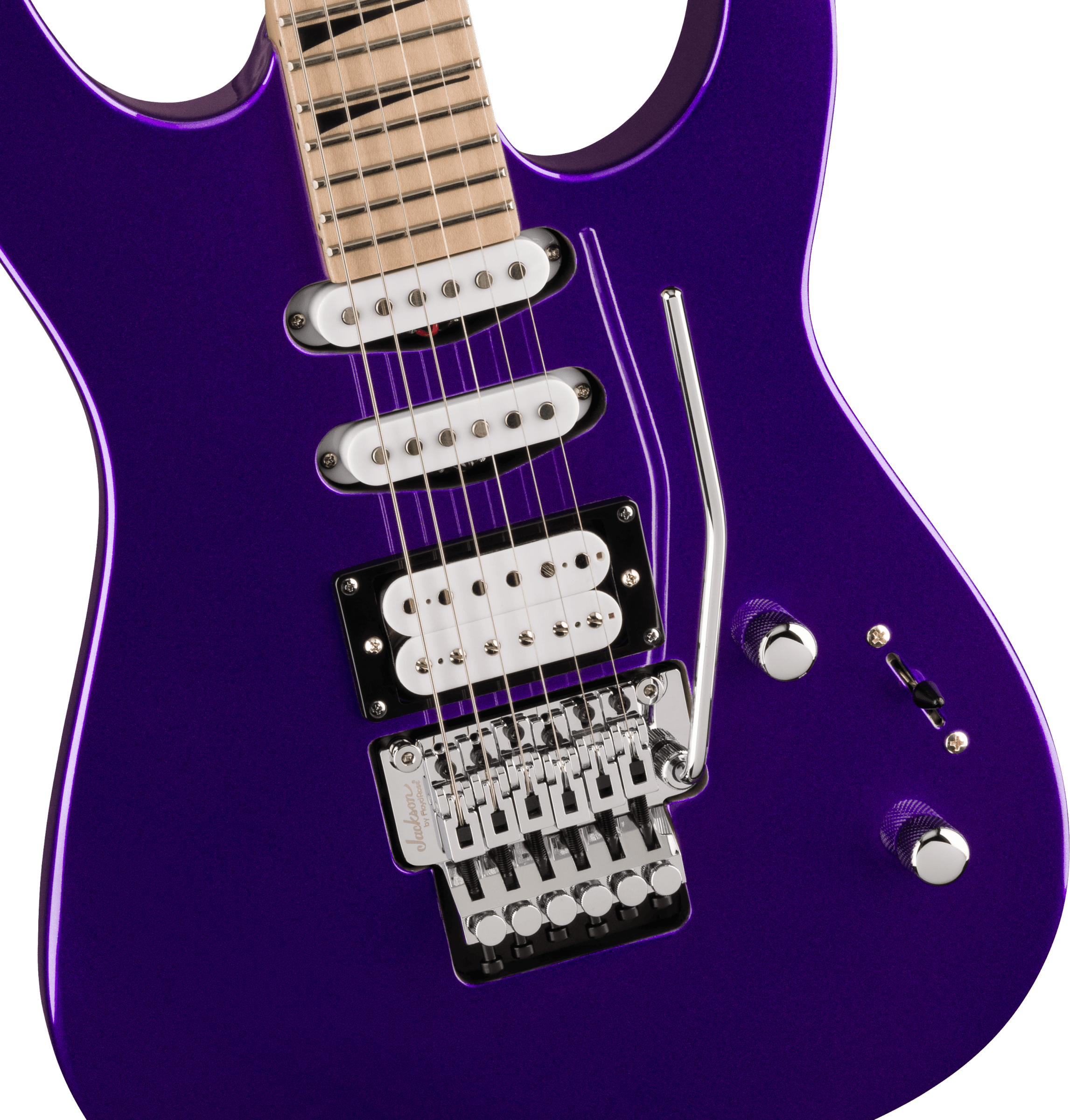 Routed for an HSS configuration, the DK3XR M is loaded with a select power trio of Jackson pickups. The Jackson high-output humbucking pickup was painstakingly voiced for full, rich tone with maximum overdrive and sustain, while the Jackson single-coil middle and neck pickups deliver that tried-and-true Strat sound. Explore this instrument’s sonic palette with a five-way blade switch and single volume and tone controls, and dive bomb at will with reliable tuning stability from the Jackson-branded Floyd Rose-licensed double-locking tremolo bridge system.