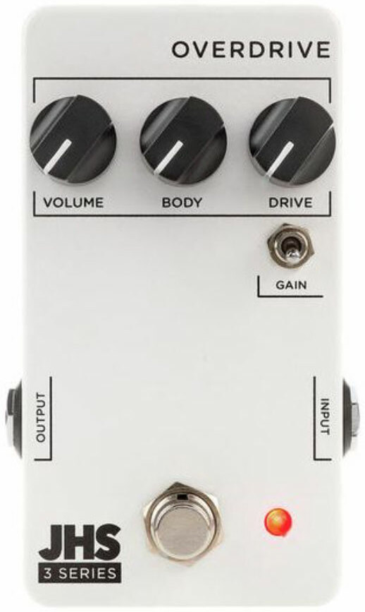 The JHS PEDALS 3 Series Overdrive compact effect pedal offers a wide range of overdrive sounds within straightforward design aesthetics. You can achieve anything from boost, transparent low gain, to huge amp-like medium overdrive sounds. The simple knob functions give you control over the Volume, Body (or EQ), and Drive. The Gain toggle gives you a choice between more saturated and compressed or more open and crunchy dynamics. This switch plays a big part in how the pedal responds to your playing and touch as a player. The JHS Pedals 3 Series Overdrive runs on 9V DC Negative Center power and consumes 12mA.