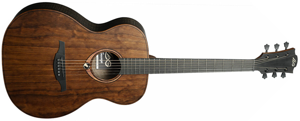 With its included gig bag, the LAG Sauvage ACE is an environmentally responsible Auditorium sized acoustic guitar featuring solid Pale BrankoWood top, Eucalyptus back/sides, Khaya neck and Brown BrankoWood fretboard.