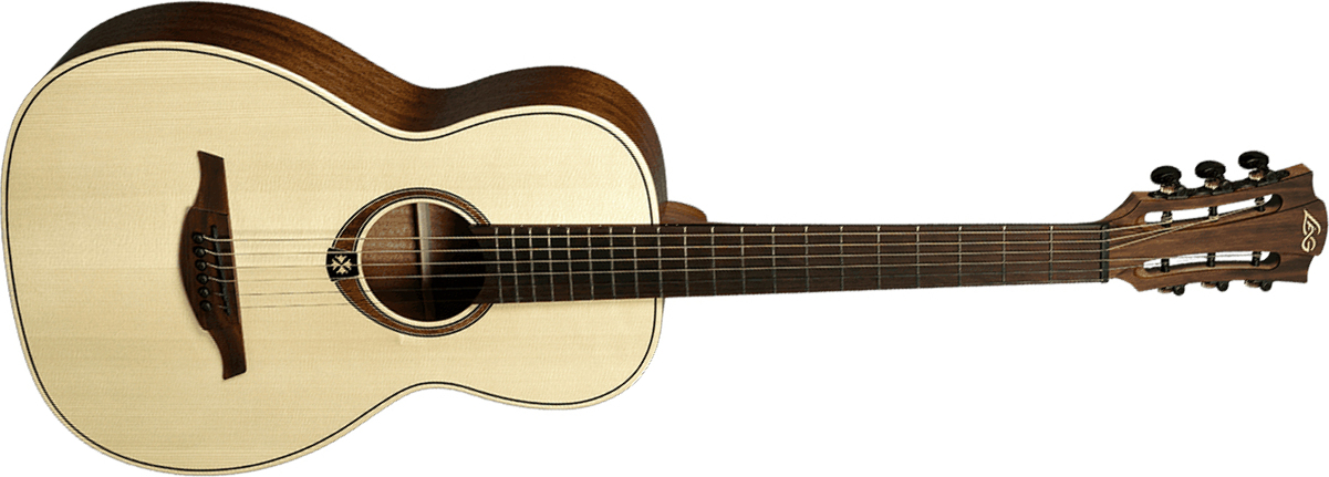 The very attractive LAG Tramontane T177PE is a Parlor acoustic/electric guitar featuring solid Engelmann Spruce top, layered Khaya back/sides/neck, Khaya neck and Brownwood fingerboard/bridge. It benefits from excellent craftmanship, and provides warm, rich and dynamic sounds.