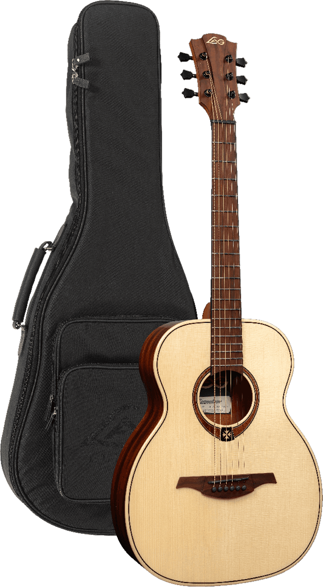With its included gig bag, LAG Tramontane Travel is a small body / short-scale acoustic guitar featuring solid Spruce top, Mahogany back/sides/neck and Brownwood fretboard.