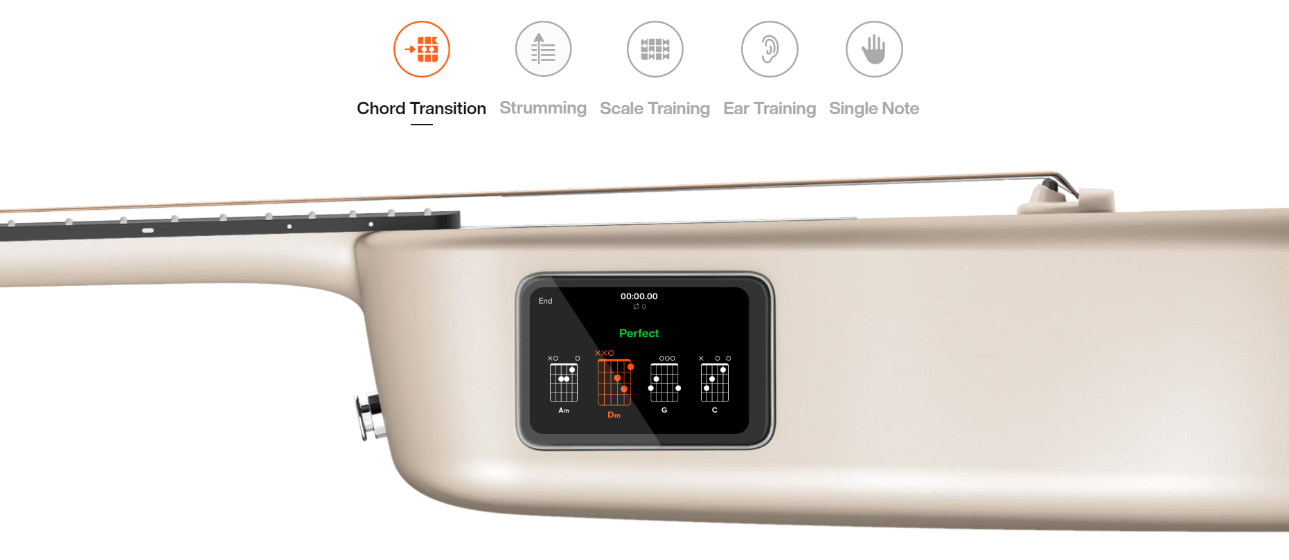 Each mode in the Practice App offers real-time feedback, analyzing your rhythm accuracy, note velocity and interval speed, and displaying them in a detailed practice report (Chord Transition, Ear Training, Scale Training, Strumming, Single Note).