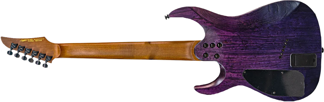 LEGATOR Ninja Performance N6FP Iris Fade is a multi-scale / fanned frets solid body electric guitar. It is a quirky and genuine riffing machine for modern shredders. Huge sounds thanks to its hybrid design (Swamp Ash body, bolt-on Maple neck, 24 frets Ebony fingerboard, alnico 5 humbucking pickups), and optimum confort with an Ibanez neck shape under Ibanez influence.