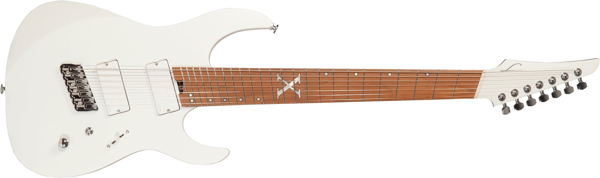 - Solid body electric guitar, baritone, 7x string, multi-scale, fanned frets