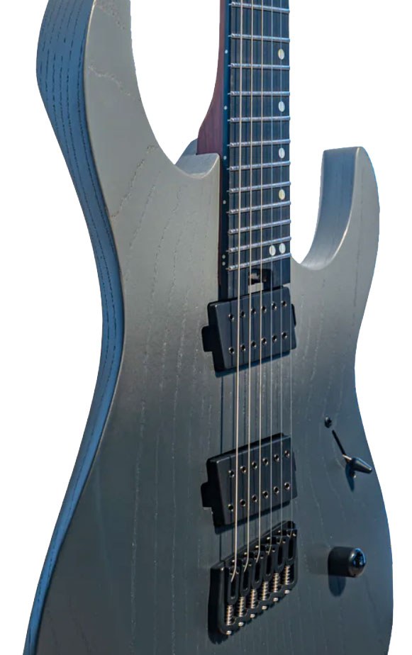 LEGATOR Ninja Performance N6FP (Smoke) is a multi-scale / fanned frets solid body electric guitar. It is a quirky and genuine riffing machine for modern shredders. Huge sounds thanks to its hybrid design (Swamp Ash body, bolt-on Maple neck, 24 frets Ebony fingerboard, alnico 5 humbucking pickups), and optimum confort with an Ibanez neck shape under Ibanez influence.