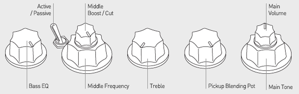 - Volume, Tone (Dual Pot), Pickup Blender, Treble, Middle, Middle Frequency (Dual Pot), Bass, Mini Toggle (Active / Passive )