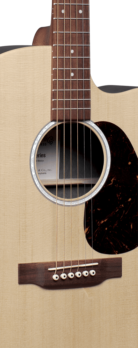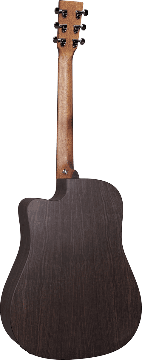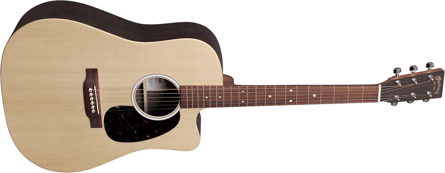 The Dreadnought cutaway sized MARTIN GUITAR DC-X2E Rosewood acoustic/electric guitar has a Sitka spruce top and figured rosewood pattern high-pressure laminate (HPL) back and sides. New mother-of-pearl pattern inlay on the rosette and fingerboard lend a richness to the D-X2E Rosewood, making it as impressive to look at as it is to play. With a Performing Artist neck, fingerboard, and bridge of select hardwood, the sound transfer of this model has been greatly improved. It is equipped with Fishman® MX electronics and strung with Martin’s Authentic Acoustic Lifespan® 2.0 strings. With a new, soft gig bag featuring headstock, bridge, and end pin protectors, a durable water-repellent exterior, and foam padding, this model is ready to go anywhere.