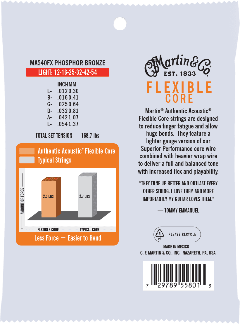 MARTIN & CO MA540FX Authentic Acoustic Flexible Core Phosphor Bronze Light 12-54 will bring out the best in any acoustic guitar. Get long-lasting, super comfortable, incredibly playable strings that take your tone to new sonic heights.