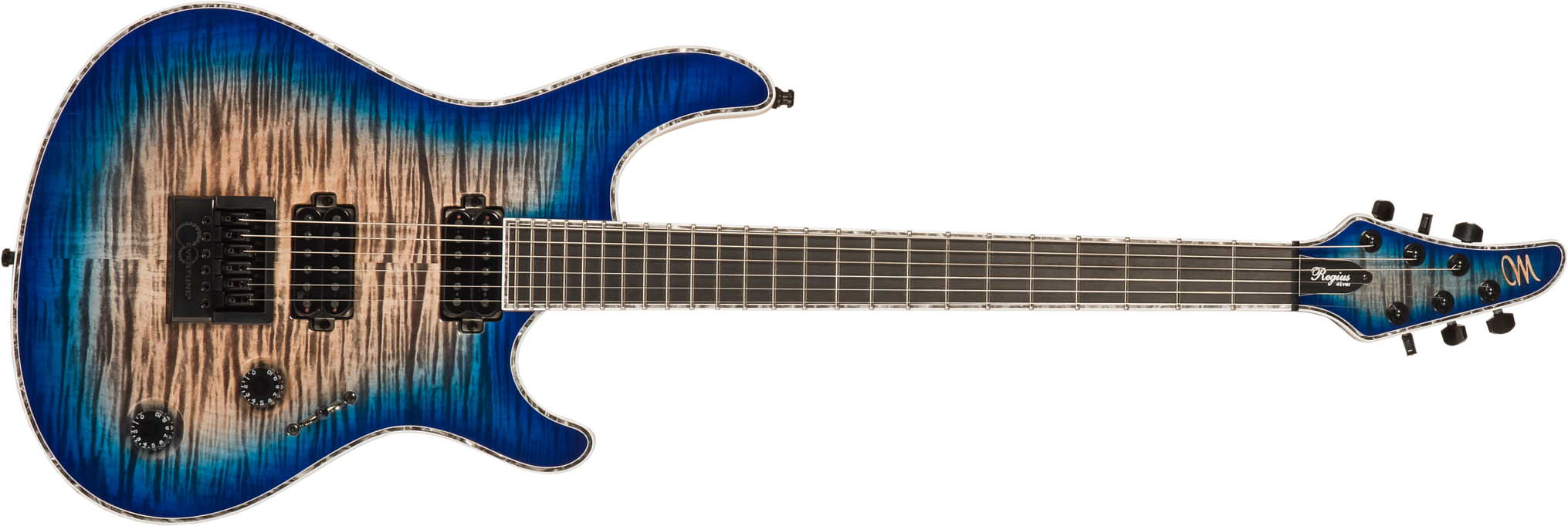 MAYONES Regius 4Ever 6 #RP2309275 (JB3TBBS) is a custom shop grade solid body electric guitar featuring 11-ply Maple/Mahogany/Amazakoe/Wenge neck-through body, Swamp Ash body with AAA Flame Maple top, 24 frets Ebony fingerboard, Bare Knuckle TKO humbucking pickups and EverTune bridge.