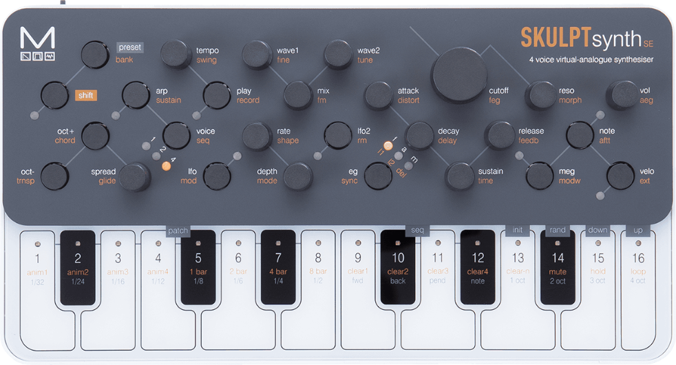 The SKULPTsynth SE is a powerful 4-voice, 32-oscillator synthesizer in an ultra-compact, portable format. A worthy successor to Modal Electronics' SKULPTsynthetiser, the Skuplt SE is the perfect toolbox for dance music producers, and packs the most coveted synth sounds to create techno, house or ambient tracks with ease!