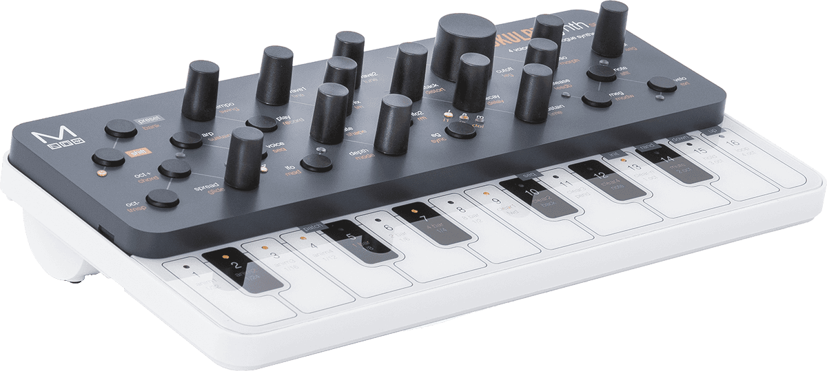 Ideal for producers of atypical and quality sounds, this 4-voice synthesizer with 8 oscillators per voice - divided into 2 WAVES groups of 4 oscillators with 6 types of waveforms - is driven by a Virtual Analogue (VA) engine, two LFOs (one global, one polyphonic), a 2-pole analogue morphing filter with resonance and three envelope generators: Filter, Amplitude and Modulation. The whole thing is controlled via a keyboard with 16 capacitive keys, 14 encoders and 13 buttons presenting a primary mode, doubled with a secondary mode that can be activated via a switch function, unlocking a second layer of settings for the oscillators, LFOs and filters.