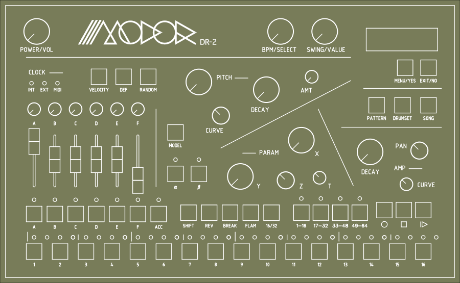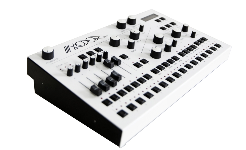 The Modor DR-2 is a 6-channel digital DSP drum synthesizer, featuring a 128-step sequencer.