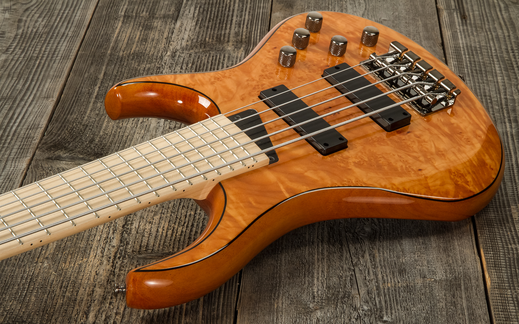 The MICHAEL TOBIAS DESIGN Kingston KZ5MP-NG five strings solid body electric bass features a high quality (and carefully constructed) Mahogany core, with a beautiful Burled Maple top. The carved Mahogany body lends a rich voice and darker overtone to the instrument, while the burl top helps to focus the low end, delivering unparalleled beauty and performance.