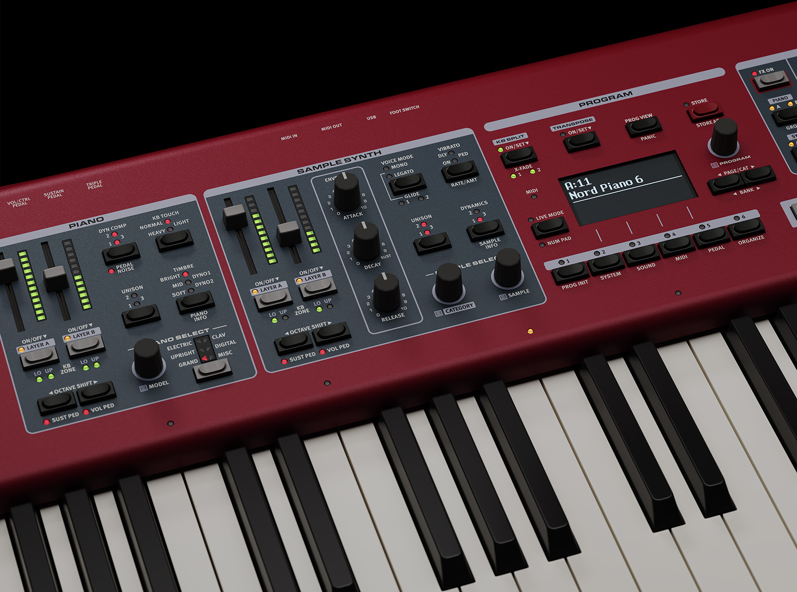 The latest generation of Nord Piano offers a new control panel design with LED faders, two piano sound modules, two synth modules, independent effects per module, and a high-end triple-sensor keyboard.