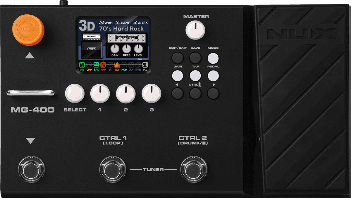 The NUX wstrong>MG-400 is a value packed modeler akin to his little brother, the MG-300. MG-400 houses 2 powerful DSP chips for high-definition White-Box Amp Modeling algorithm (TS/AC-HD) and Core-Image post-effects. Since releasing the MG-300, people have been blown away by the sound and playability, not to mention the ease-of-use tone tweaking and intuitive interface. And now, the MG-400 builds upon the MG-300 feature set moveable signal blocks, 12 IR COLLECTION slots, flexible P.L block with MIN & MAX parameter setup, abundant SYSTEM MENU, and physical MASTER volume knob, MG-400 is now the best value modeler for the money.