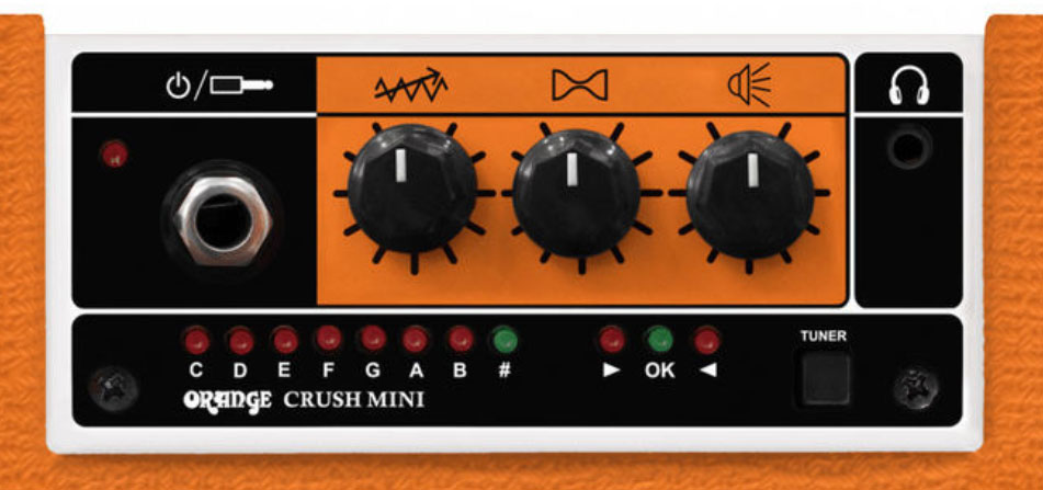 Working with a 9v battery or optional power adaptor, and equipped with a built-in tubner, the 3 watts ORANGE Crush Mini is the smallest amplifier electric guitar from Orange. It gives you classic Orange tone , whether warming up backstage on the road, at practice, or in your bedroom.