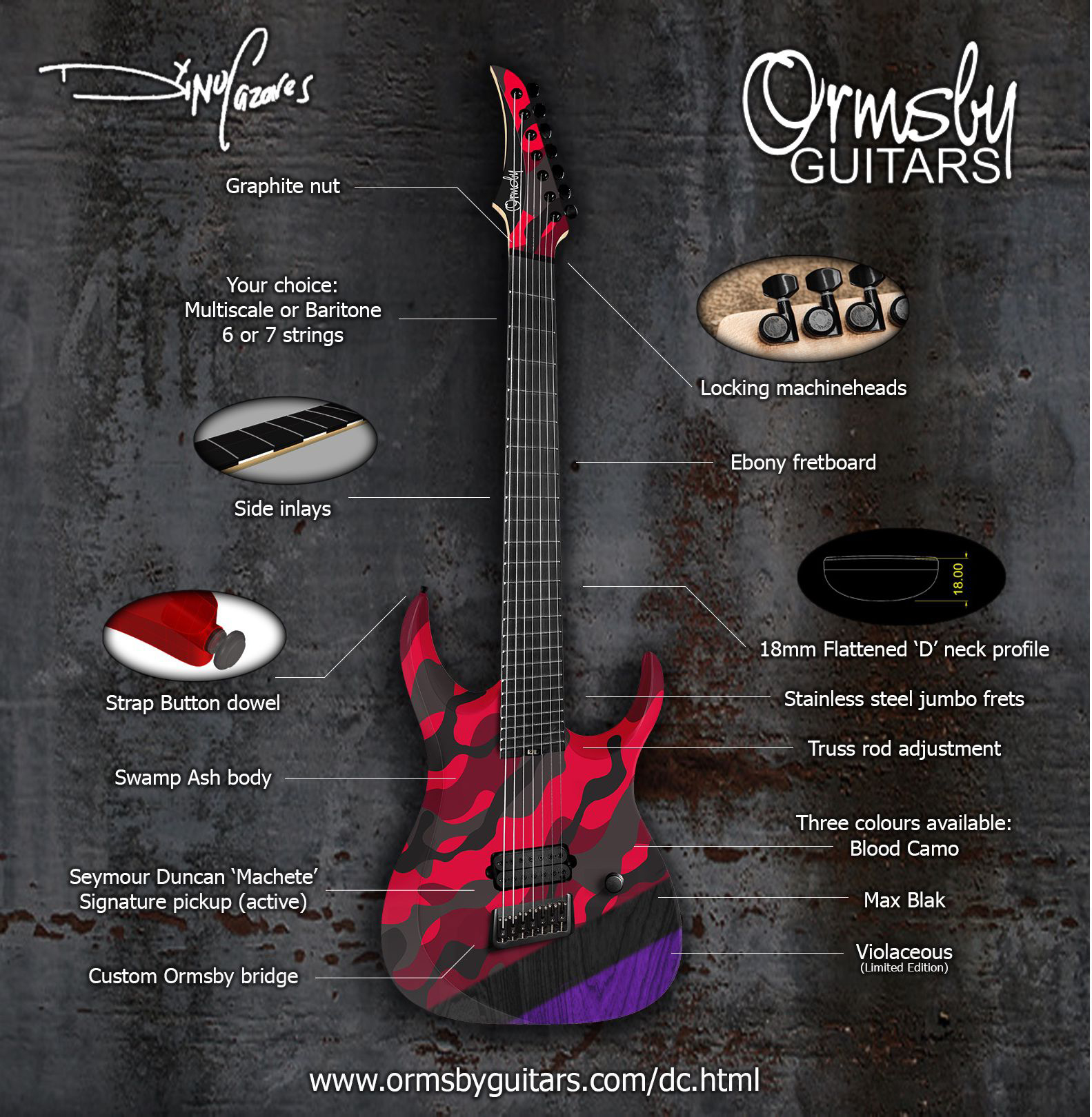 The DC will also include Dino's "Machete" Seymour Duncan pickups along with our Ormsby custom bridge and locking machineheads. As mentioned above, we are offering the DC in both multiscale (26.5-27.5") and baritone (26.5") options so please choose accordingly. Your DC will include a hard case along with a signed Certificate of Authenticity by Dino Cazares.