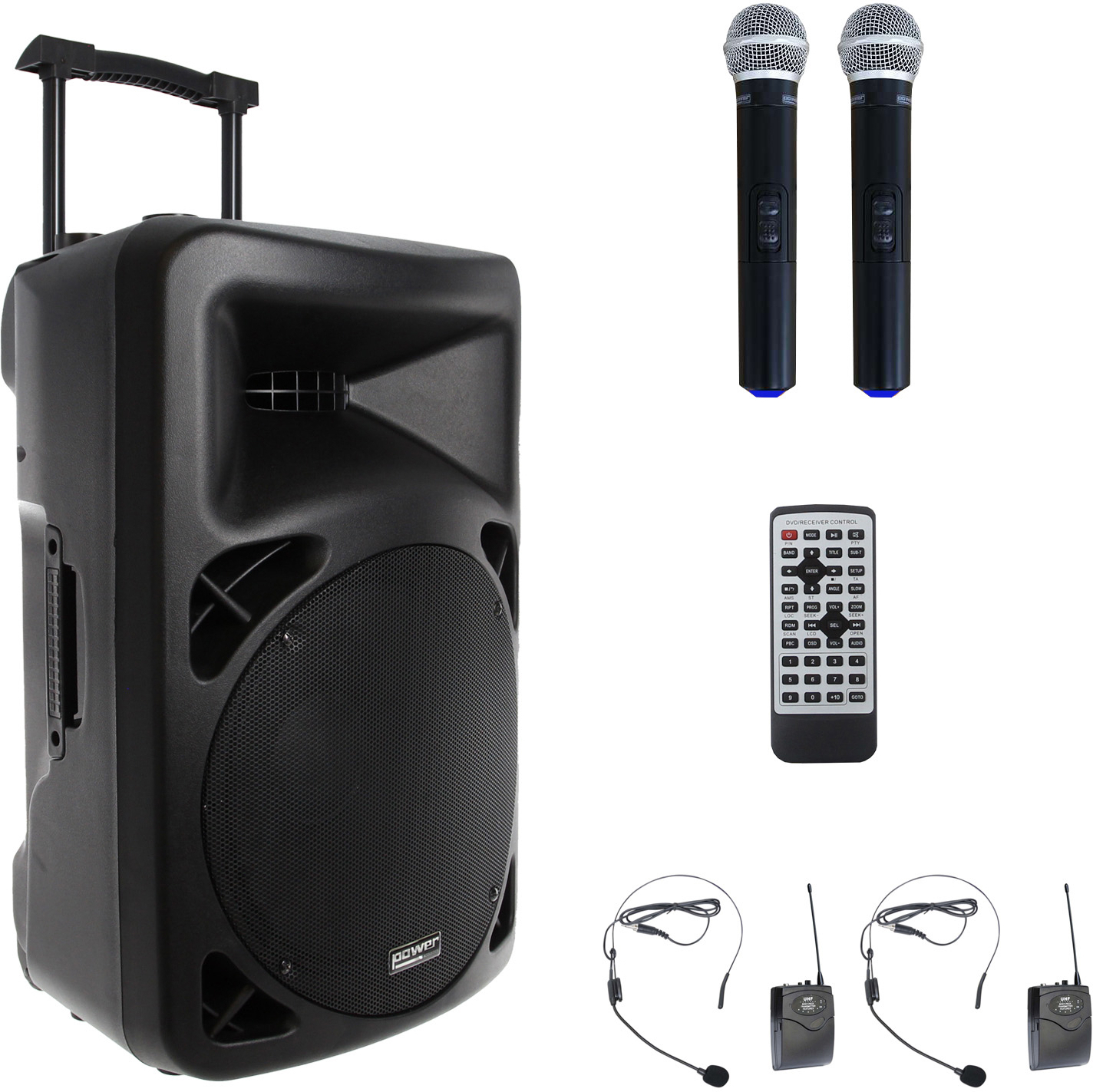 The POwer Acoustics BE 9515 PT V2 is a Portable PA system with MP3/SD/USB/DIVX/Bluetooth CD player + 2 handheld microphones and 2 UHF headphones.