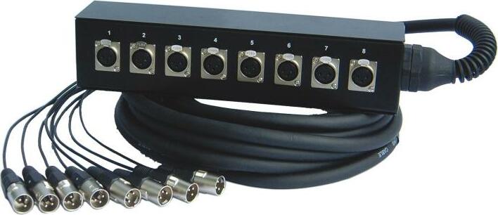 10 meter multipaar met 8 vrouwelijke XLR-ingangen op box naar 8 mannelijke XLR's.