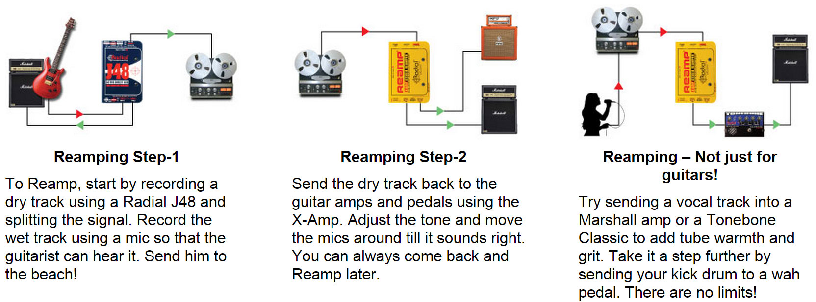 The Radial X-Amp is an active Reamper™ that allows the engineer to play a pre-recorded track back through guitar amplifiers and pedals. This opens the door to explore new musical sounds and spur on the creative process so that your recording stands out.