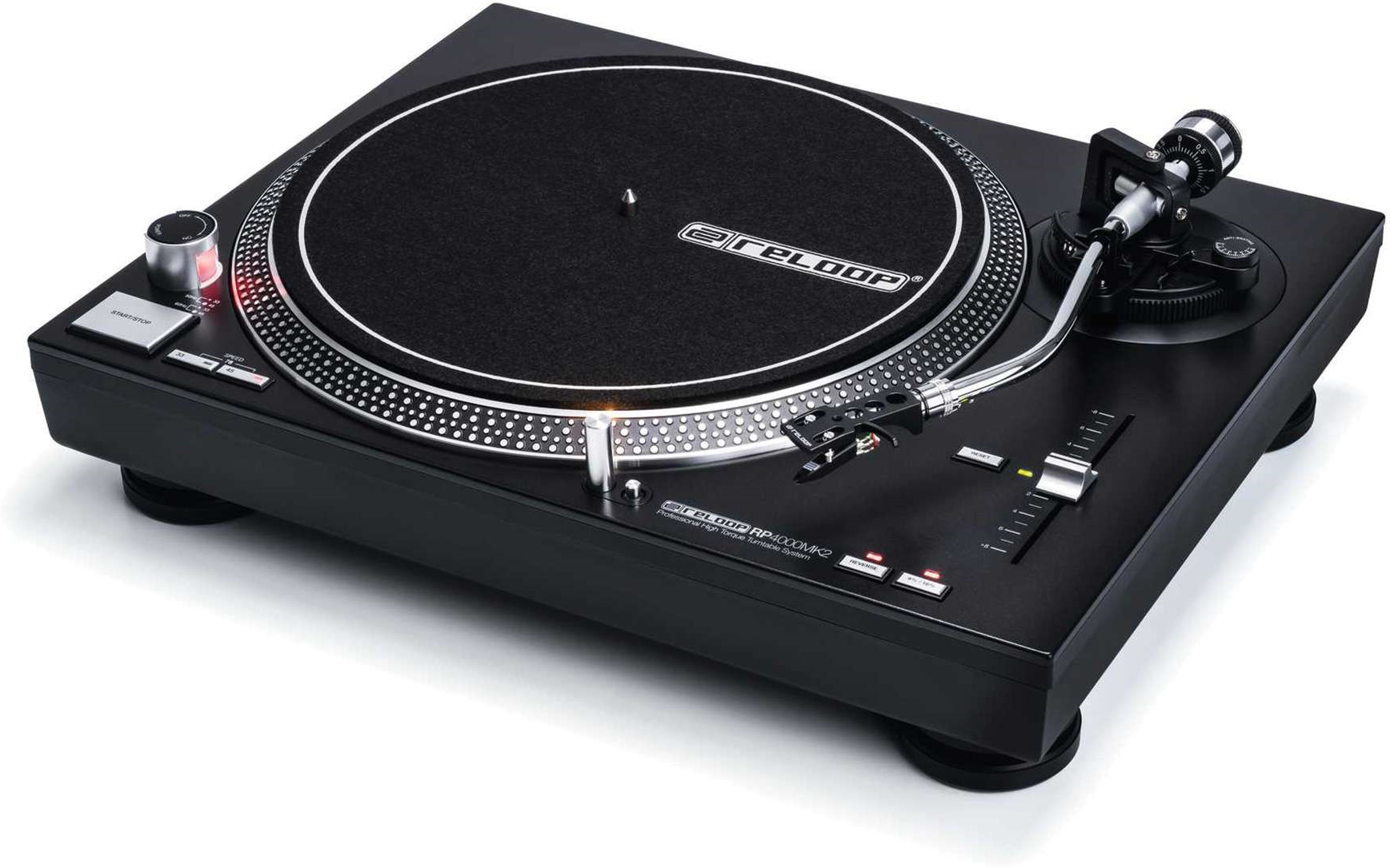The Reloop RP 4000 MK2 features a new panel with touch-sensitive metal buttons, a high precision adjustable pitch (+/- 8% and +/-16%) and a powerful motor with a starting torque of 1.8Kg/cm. It comes with a high quality Ortofon OM BLACK pre-mounted cartridge.
