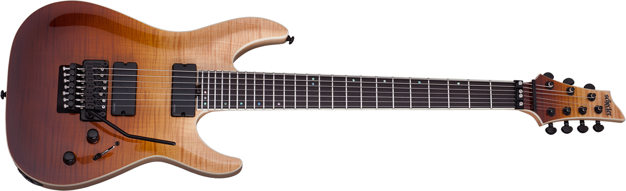 The SCHECTER C-7 FR SLS Elite (1356) is a 7-string baritone solid body electric guitar, splendid iteration of the benchmark C-1 with Swamp Ash body, flamed Maple top, multi-woods neck-thru-body, 24 frets Ebony fretboard, active/passive Fishman Fluence Modern pickups, and Floyd Rose 1500 double locking tremolo.